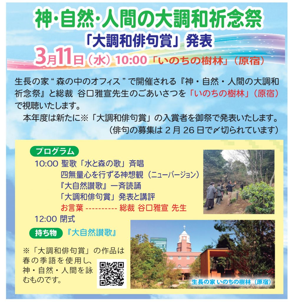 宗教法人「生長の家」の2021年運動方策の中に「居住する地域の自然や文化遺産の豊かさを改めて見直し、固有の自然の恵みと、その自然と調和した文化的伝統に感謝し、所属教区の教化部のサイト等に掲載し、自然と人間の深い関りを提示する。」という取り組みが掲げられています。